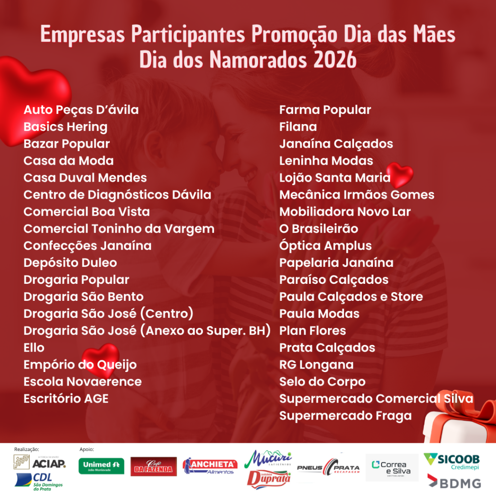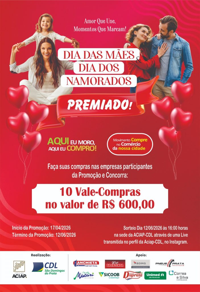 Clique aqui para acessar o regulamento da promoção. Notícias relacionadasGanhadores Natal Premiado 202512 de janeiro de 2026O Natal Premado 2025 está chegando para movimentar o comércio de São Domingos do Prata!7 de novembro de 2025Mérito Empresarial 20256 de novembro de 2025Evento Nosso Agro13 de outubro de 2025Boas-vindas ao futuro sustentável11 de setembro de 2025Circuito Regional E-Minas 2025 tem início em São Domingos do Prata com foco na diversificação econômica21 de junho de 2025
